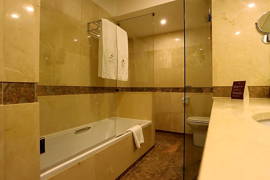 A spacious room with a luxurious bathroom equipped with signature amenities.